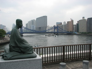 日本では海の日。3連休であったのであるが、あっという間に過ぎてしまった。休みの日にはやりたいことが結構あって、何やかやと時間が過ぎる。それでも今日も散歩に出た。テレビでは今日も猛暑であったと報道しているが、僕にはそれほど暑いと感じられない。帽子をかぶって昼下がりの町を歩いた。浜町公園のすぐ裏を隅田川が流れている。新大橋を歩いて渡ってみた。向こう岸は江東区である。川の東にあるから江東区と言うのかと、橋の上で今更のように気が付いた。川沿いの散歩道を行くと、20メートルおきくらいに芭蕉の句碑が並んでいる。江東区の深川一帯は松尾芭蕉のゆかりの地であるということで、芭蕉記念館や、史跡庭園があった。昔の旅人は、着るもの、食べるもの、下着の洗濯、メモ用紙の管理などをどのようにしていたのであろうかと思う。さすらいの旅に出たいと思うことは僕にもあるが、昔の旅は、現代では想像も出来ないほど、危険に満ちていたに違いない。いつも電子計算機やあれこれと重い荷物を持ち歩く僕は、その重さに負けて、とうていさすらいの旅に出ることはできないなと思った。
